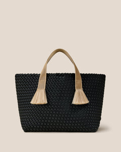 Handwoven neoprene in true black with nylon handles in taupe. Unique yet versatile, the Tulum Medium Tote is a vacation-ready update on our classic St. Barth's silhouette.